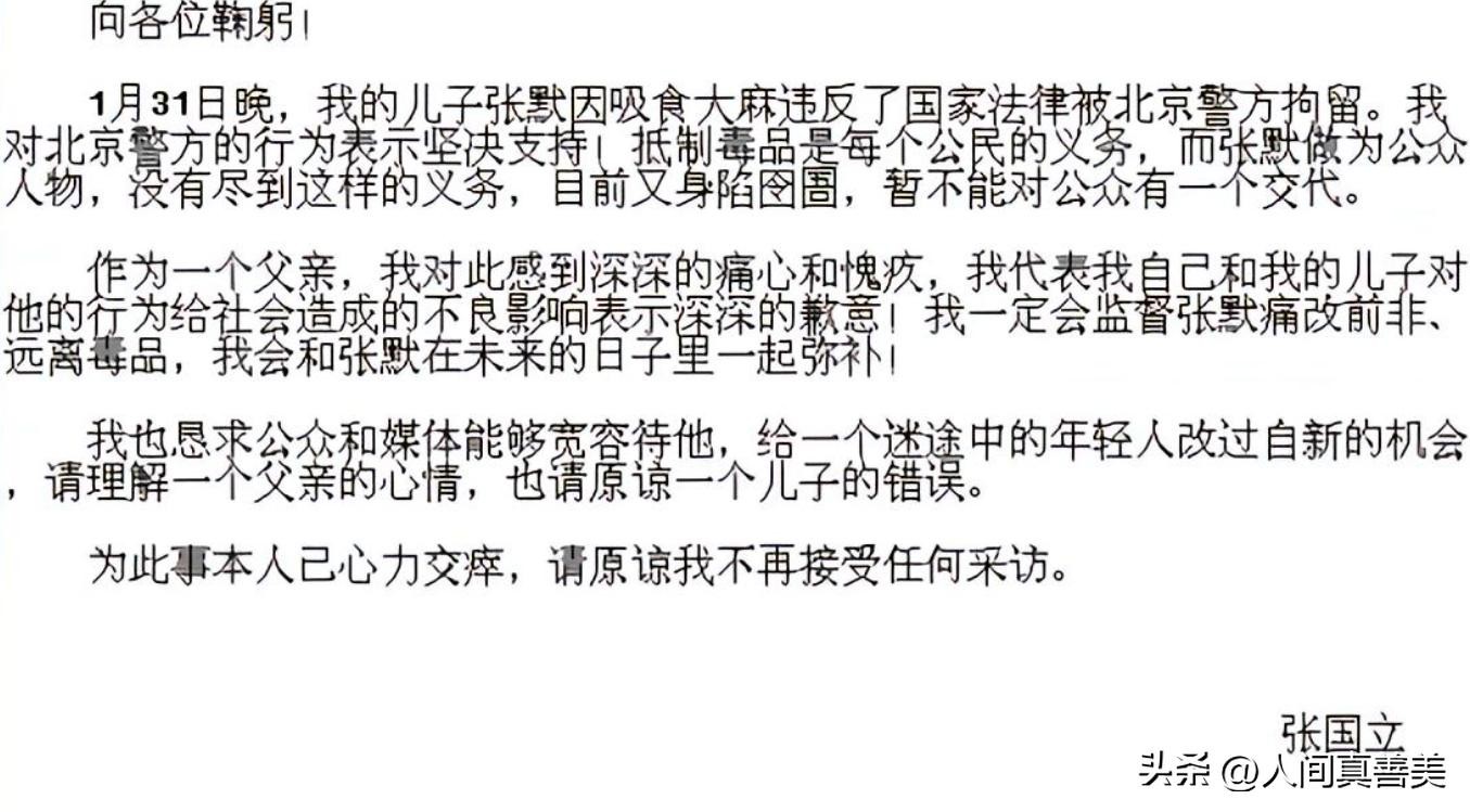 2012年北京警方抓获张默在一别墅中吸食违禁品,被拘留了13天,张国立在得这个事后正所谓是天都塌了。