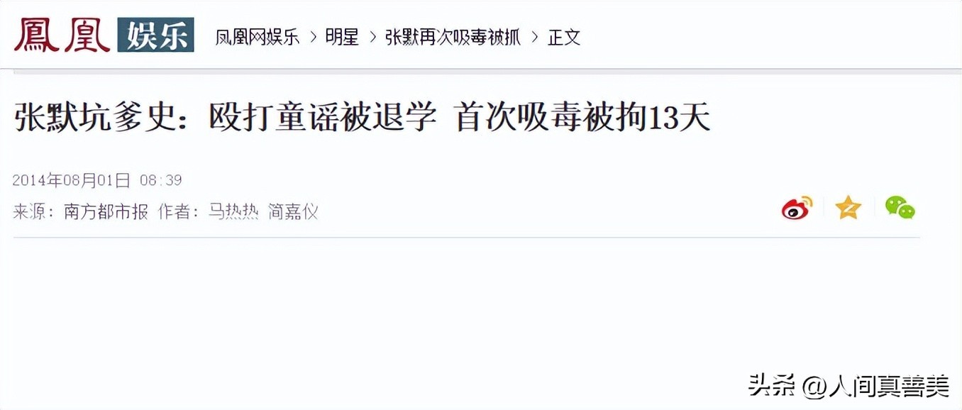 参考资料:《张默坑爹史:殴打童谣被退学 首次吸毒被拘13天.》 凤凰网. 2014-08-01[2023-07-18].