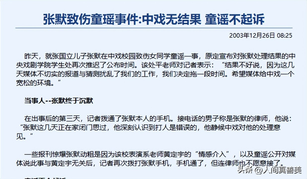 参考资料:《张默致伤童瑶事件:中戏无结果 童谣不起诉.》 中国经济网. 2003-12-26[2023-07-18].