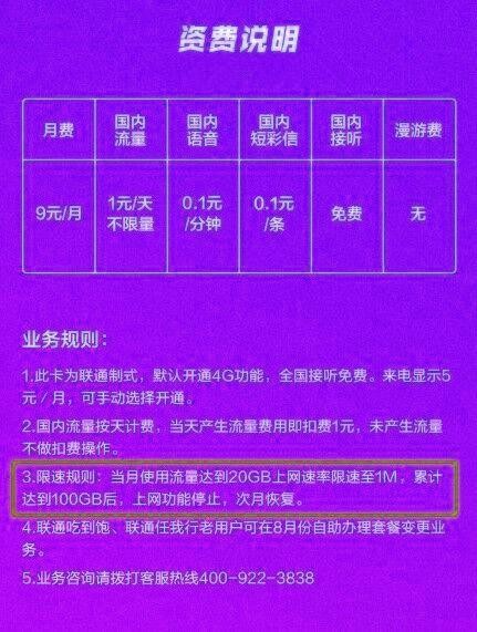 说完基本费用咱们再说一下限速条件。与很多无限流量卡一样,属于20GB降速标准。也就是说超过20GB以后将将至1M,超过100GB将无法在使用上网功能。