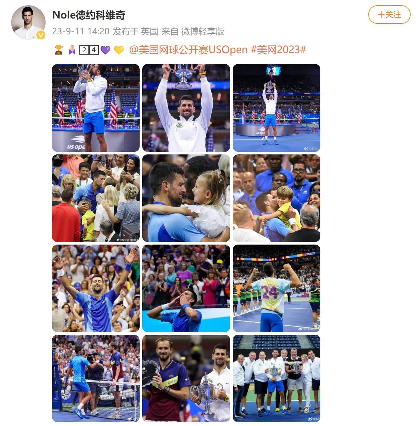 成就美网四冠王,德约科维奇夺得大满贯第24冠,微博晒“24”庆祝