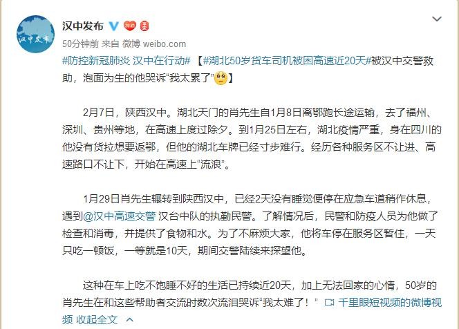 【#湖北50岁货车司机被困高速近20天#被汉中交警救助,泡面为生的他哭诉“我太累了”】