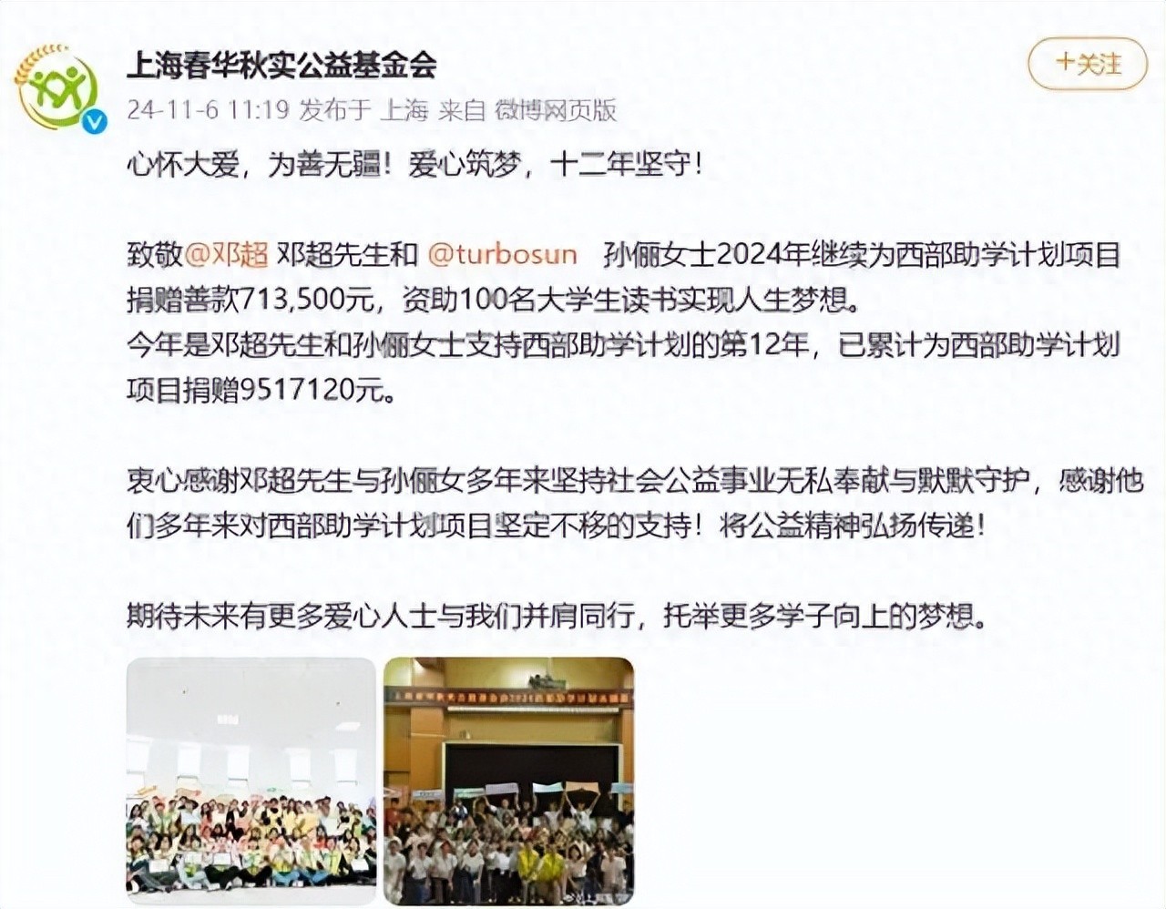 11月6日,上海春华秋实公益基金会官博透露邓超和孙俪2024年继续为西部助学计划项目捐赠善款713500元,资助100名大学生读书。