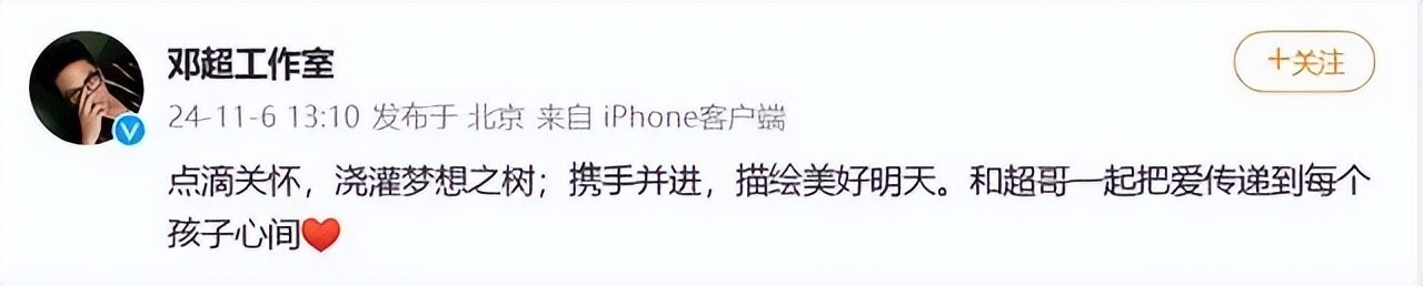邓超工作室转发回应:“点滴关怀,浇灌梦想之树;携手并进,描绘美好明天。和超哥一起把爱传递到每个孩子心间。”