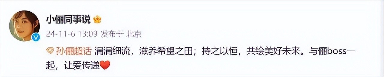 对此,孙俪工作室转发回应:“涓涓细流,滋养希望之田;持之以恒,共绘美好未来。与俪boss一起,让爱传递。”