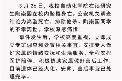 2018年3月26日,武汉理工大学研三学生陶崇园,从五层宿舍楼顶天台一跃而下,一个年轻的生命就这样永远地离开了。
