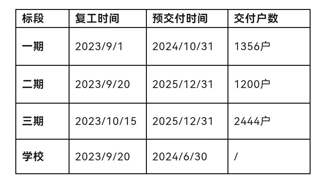 第三阶段为2023年10月15日前启动二期剩余未封顶楼栋(6#、7#、15#、16#、17#楼)及三期主楼主体检测、塔吊恢复、安全防护、施工电梯搭设等复工前准备工作,准备工作完成后进行主体施工。二期、三期预计于2025年12月31日交付。