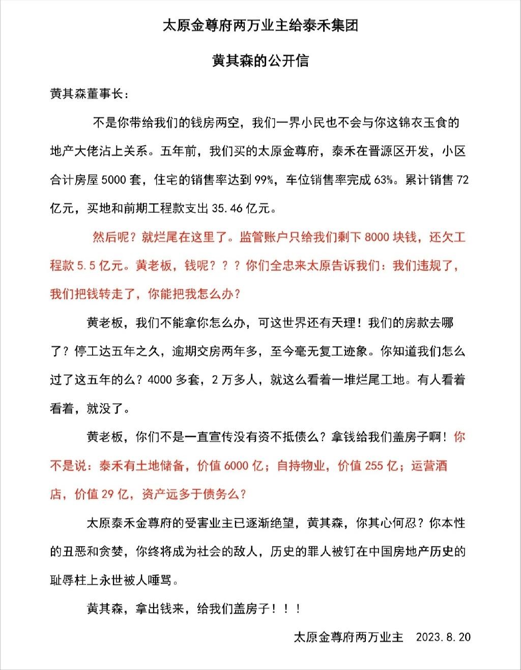 就在此次复工消息官宣的十几天前,太原金尊府业主仍在网络维权,曾再次向泰禾集团董事长黄其森致信,要求“拿出钱来,给我们盖房子”,并发出一连串质问:5年前购买了太原金尊府,小区合计房屋5000套,住宅销售率达到99%,车位销售率完成63%,累计销售72亿元,买地和前期工程款支出35.46亿元。但房子却烂尾了,监管账户只剩8000块钱,欠工程款5.5亿元,房款去哪了?