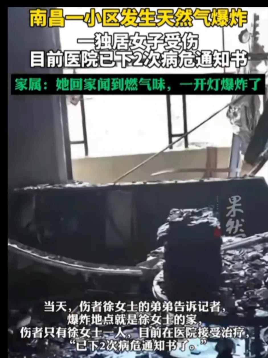 江西南昌一小区住户家里发生天然气爆炸的事故,烧伤女主被紧急送往医院救治,医院下达两次病危通知书。