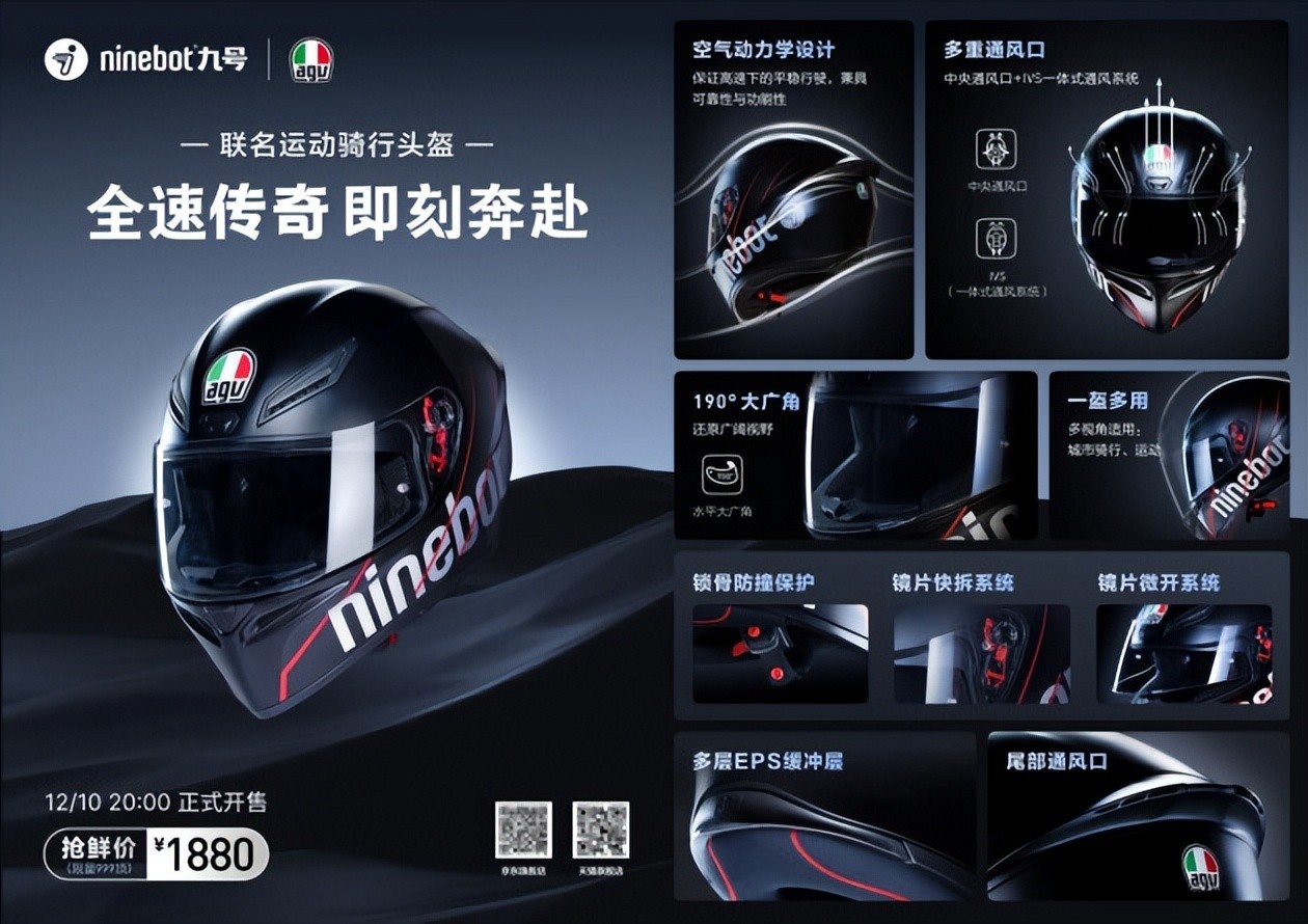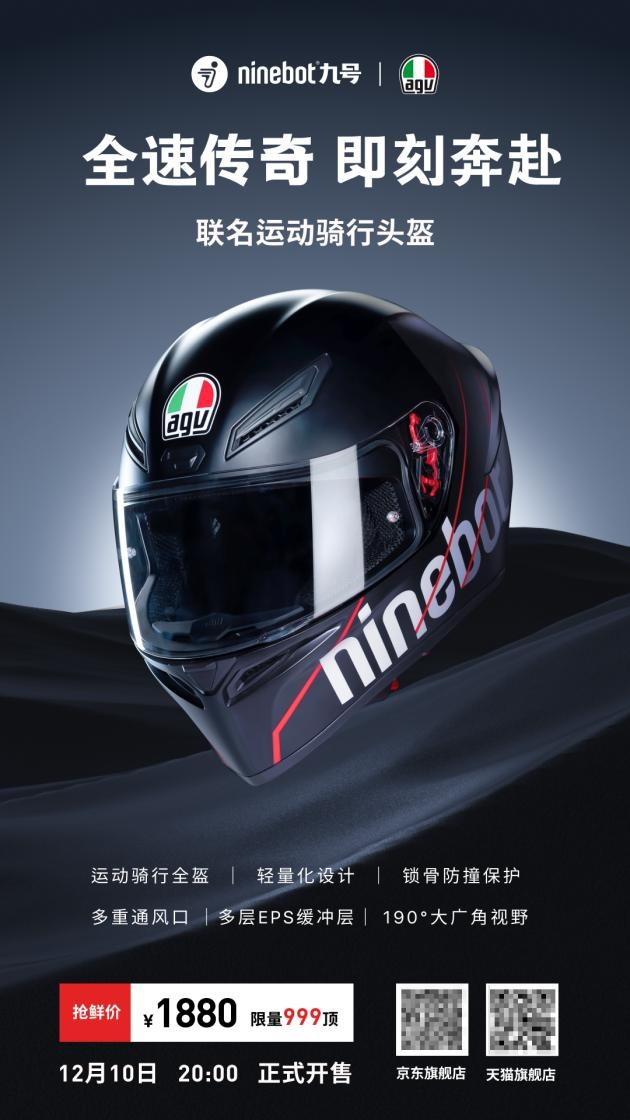 此次合作为Ninebot九号与AGV首度携手,旨在创新科技与竞速经典融合,创写全新探索篇章,据悉,此款头盔限量仅999顶,于12月10日晚八点在九号天猫/京东官方旗舰店同步上架。抢先下单,锁定专属于你的出行特权。