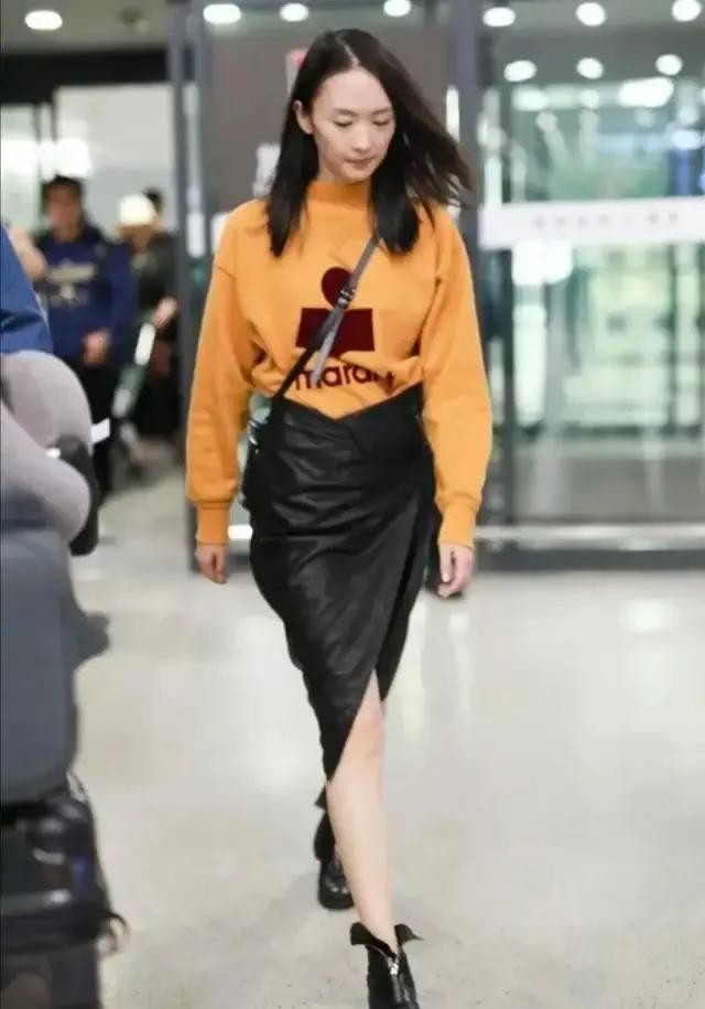 婚后的童瑶也开始走性感女人路线,一件黄色卫衣塞进黑色皮裙看起来有些勉强,黑色皮裙格外有特点,包股设计看起来有点修身,非常有线条感的提拉开衩设计,个性十足又时尚性感。童瑶这身打扮很适合她的身材,活力满满又格外的帅气,马杆腿线条感也很强,这身材感觉一股风都能吹倒。