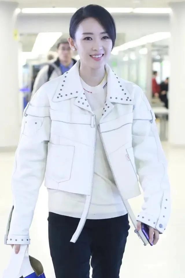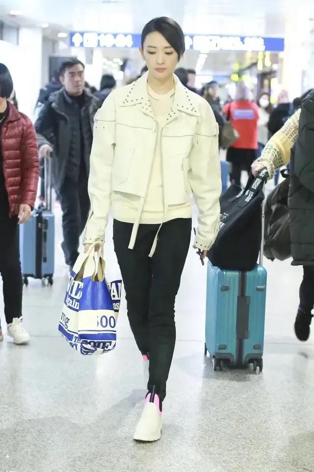 童瑶长相比较清秀可人,圆润的脸蛋自带减龄感,加上出众的衣品压根让人猜不出真正的年龄,机场造型白色毛衣搭黑色紧身裤,白色休闲鞋与白色皮夹克的搭配就是点睛之笔了吧,尤其是皮夹克领子处的柳钉装饰,为整体简约风格增加一丝放放荡不羁的帅气感,个性张扬又不失时尚帅气,简简单单的造型也能被童瑶穿出自己的个性风格,亮点满满哟!手中拿的蓝色拼接手提包也惹眼,清新活力又显时尚。