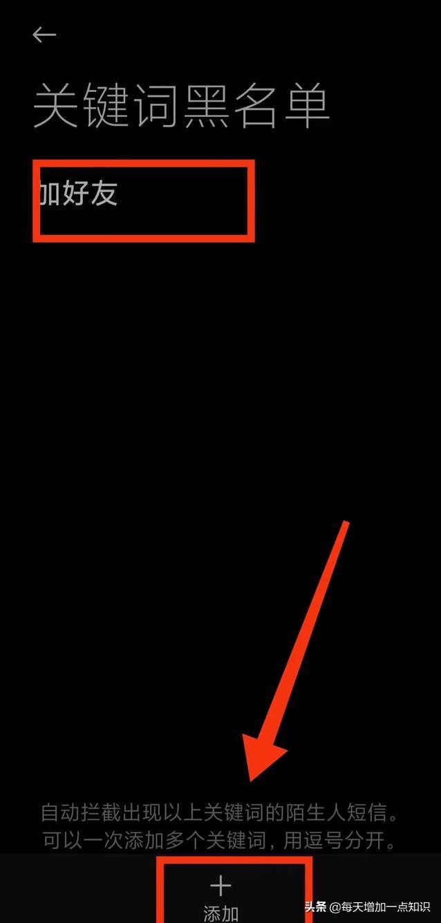 设置完成后,手机就会自动拦截出现以上关键词的陌生人短信。可以一次添加多个关键词,用逗号分开。