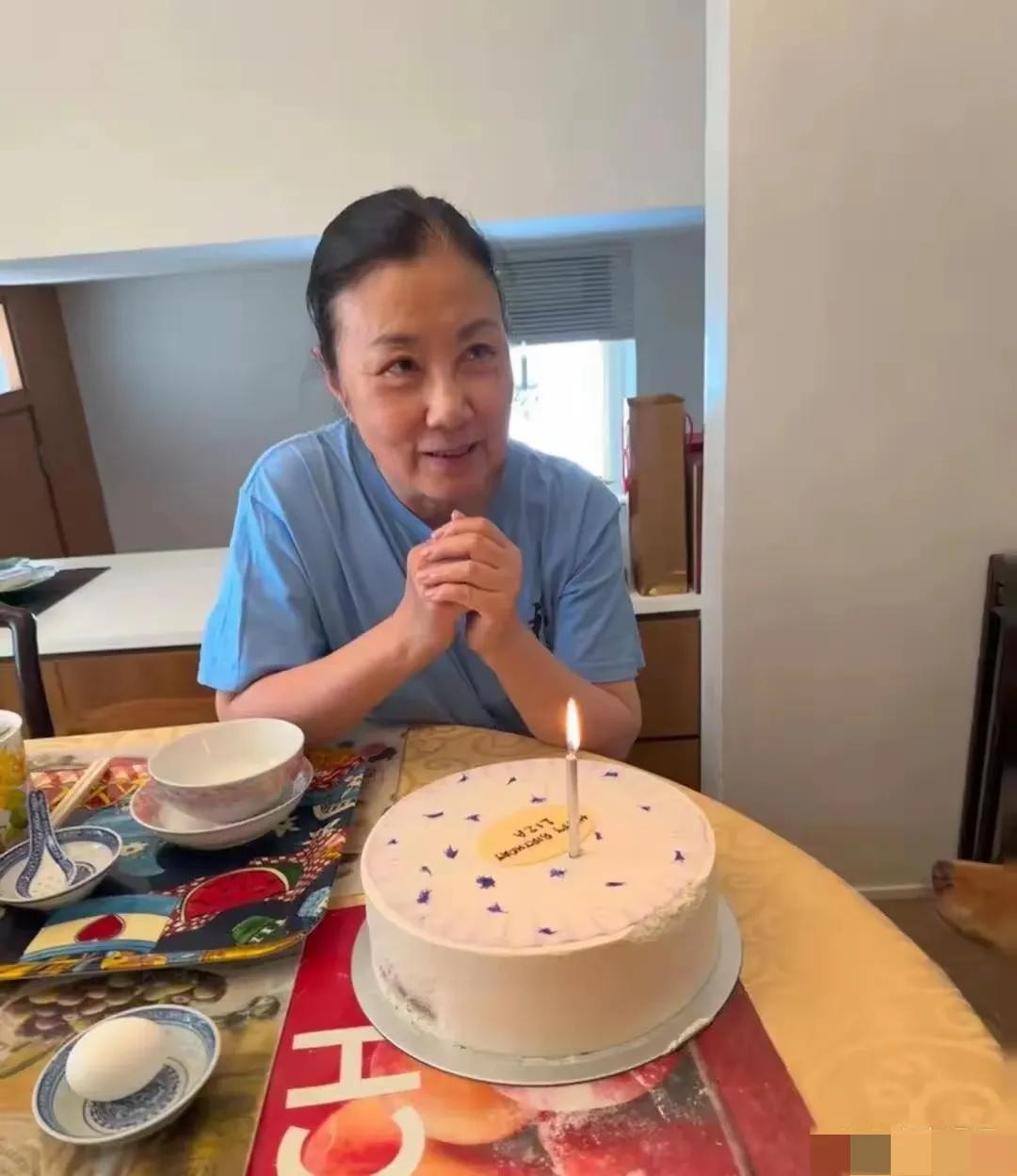 照片中,汪明荃没有化妆,穿着也十分朴素,吃的也不是什么大餐,蛋糕看起来也非常普通,整个人很接地气!