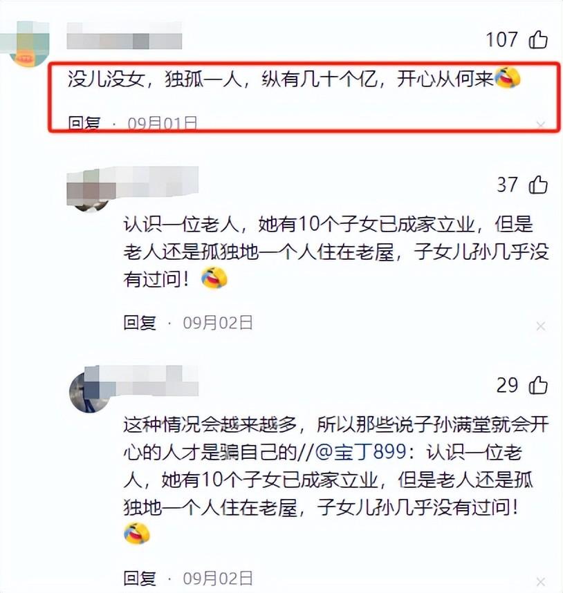 这时候有网友表示:“没儿没女,独孤一人,纵有几十个亿,开心从何来。”