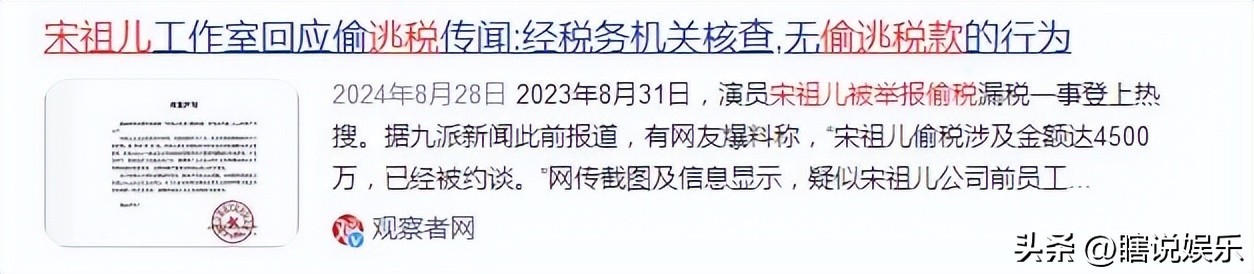 消息来源:2024年08月28日一观察者网一宋祖儿工作室回应偷逃税传闻:经税务机关核查,无偷逃税款的行为