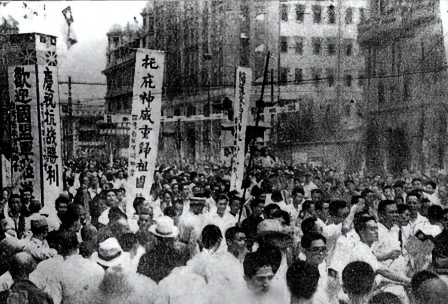 1945年,在武汉的台湾省旅汉同乡会组织欢迎队伍庆祝抗战胜利