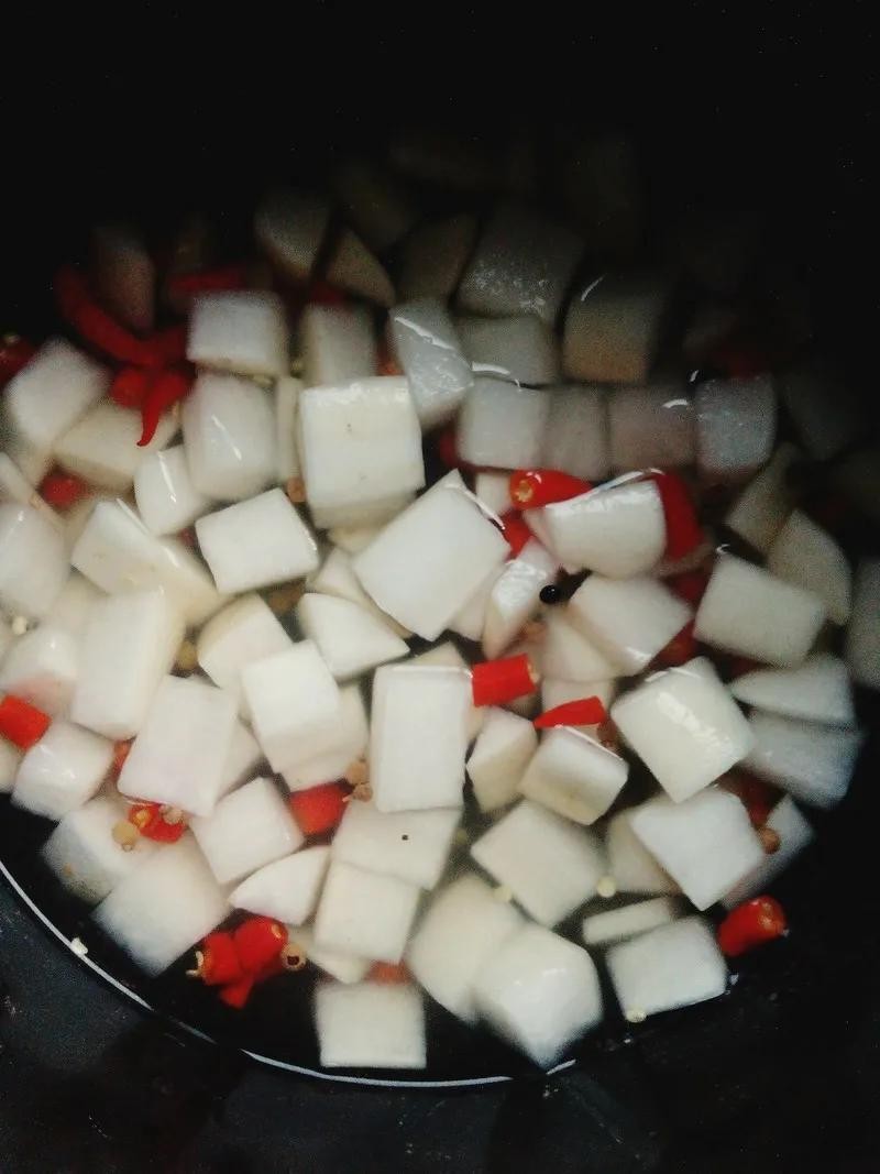 将萝卜与辣椒白醋混合起来,放入白糖,喜欢吃甜点的,可多加些,加入凉白开,盖过萝卜就好。