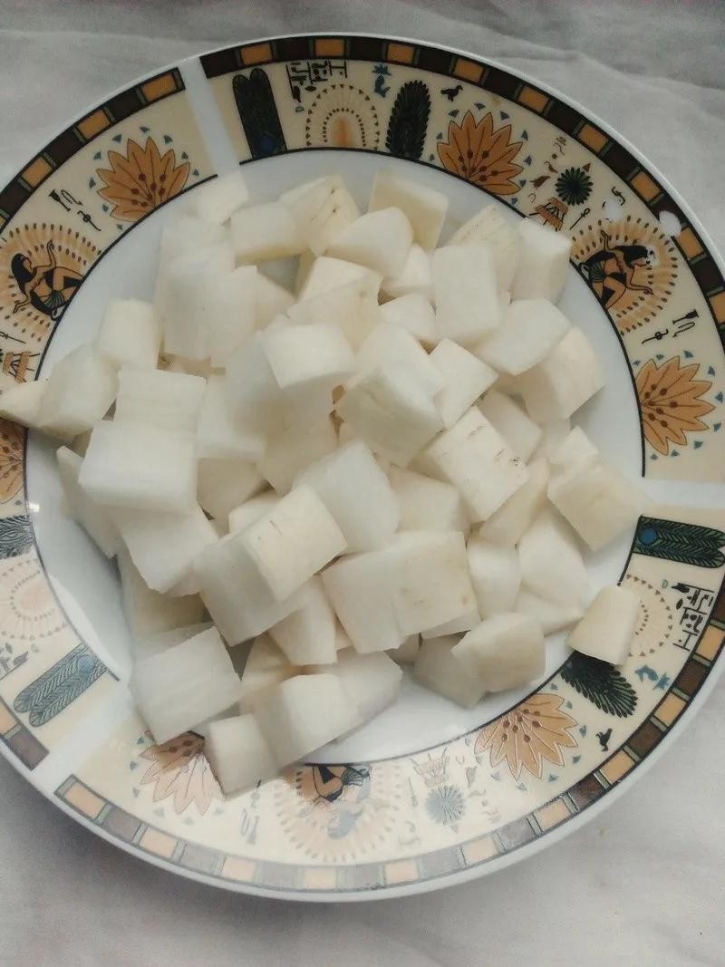 白萝卜洗净别去皮,切丁(形状自定),加盐腌渍出水,这步可以去掉白萝卜的辣味,腌渍一个多小时白萝卜出了许多水分,把这些水倒掉随后用凉白开洗几次。