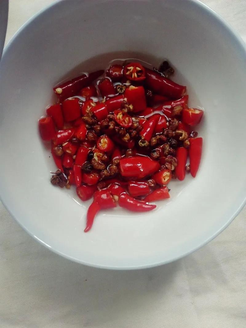 小米椒切断,不够辣,可加花椒,然后再倒入适量白醋