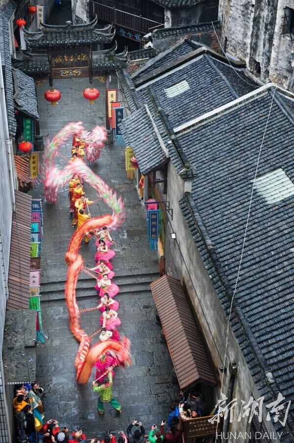 古商城里的舞龙表演。 尹忠 摄