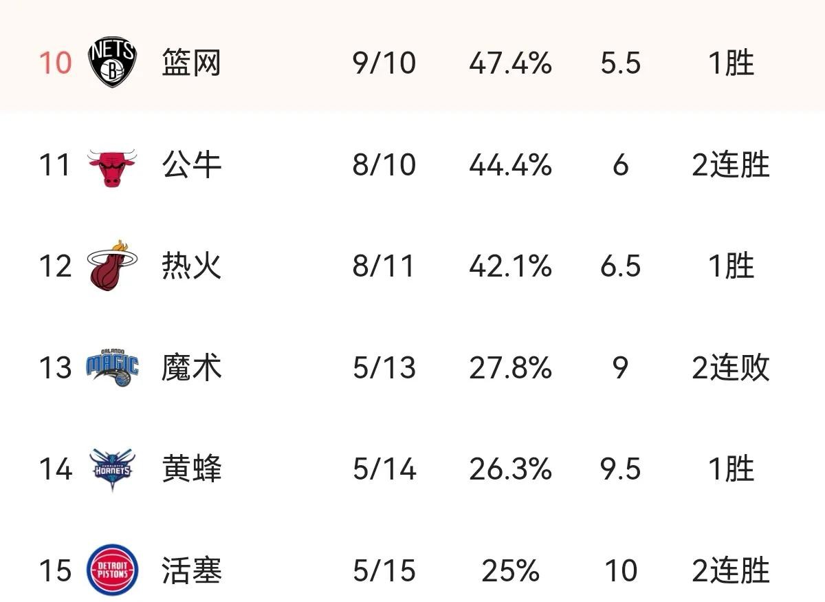 2.东部排名榜第10-15名:今日篮网112-98轻取猛龙,目前与76人仅相差0.5个胜场差,排名东部第10名。公牛118-113战胜东部前榜首雄鹿,排名第11名,喜提2连胜,也许2连胜不值得一提,但是先胜凯尔特人,再胜雄鹿,就绝对是全联盟最牛的球队了。热火113-105击败奇才,位列东部第12名。魔术5胜13负,排名东部倒数第三。黄蜂107-101战胜残阵76人,有些胜之不武,目前排名东部倒数第二名。活塞125-116击败西部黑马爵士,目前5胜15负,依然垫底东部排名榜。活塞先胜掘金,再胜爵士,2连胜的含金量还是比较高的。