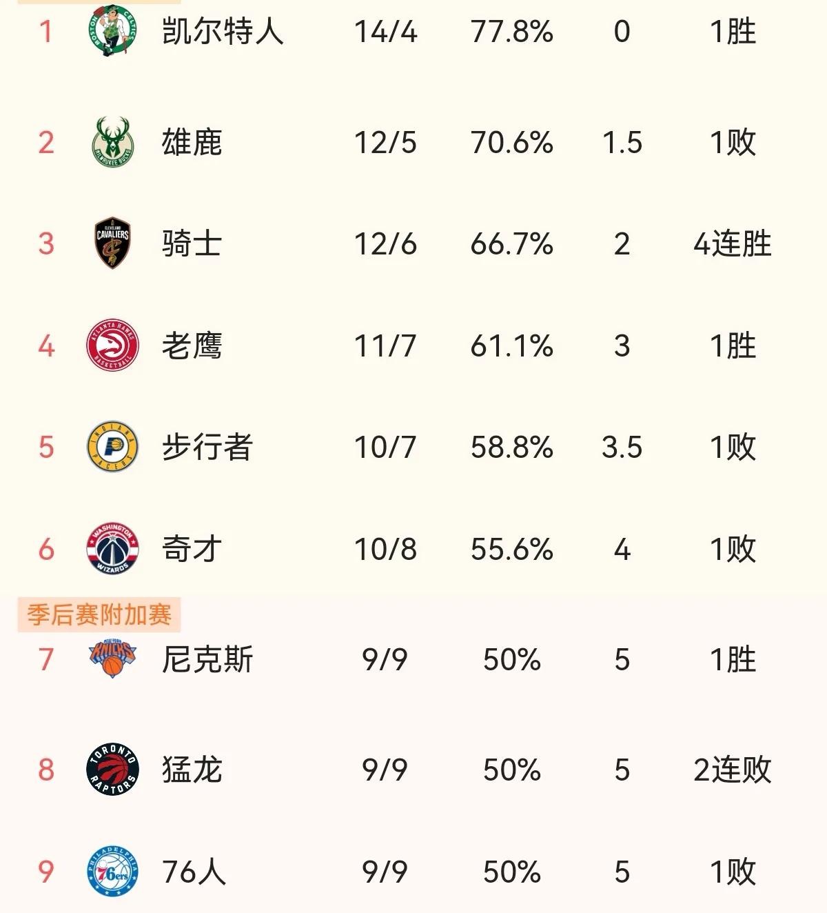 1.东部排名榜前9名:今日凯尔特人125-112击败独行侠,塔图姆37分13篮板,周杰伦的弟弟31分,使得东契奇42分8篮板9助攻沦为空砍。赛后,凯尔特人14胜4负,位居东部榜首,也是全联盟第一名。雄鹿113-118不敌公牛,字母哥36分11篮板7助攻同样沦为空砍,目前雄鹿已落后凯尔特人1.5个胜场差,排名第二,仅领先骑士0.5个胜场差。今日黑马骑士114-96轻取开拓者,喜提4连胜,成为东部目前连胜最多的球队。老鹰115-106战胜西部小黑马国王,国王赛前已经取得7连胜,创下多项纪录,但在老鹰这里还是无缘8连胜。目前老鹰排名东部第四名。步行者101-115不敌森林狼,排名第五名。奇才105-113输给热火,战绩10胜8负,排名东部第六名。猛龙98-112不敌篮网,残阵76人101-107惜败黄蜂。目前尼克斯、猛龙、76人3支球队战绩相同,都是9胜9负,分列东部第7-9名。虽然残阵76人不敌黄蜂,但虽败犹荣,毕竟缺少三大主力。