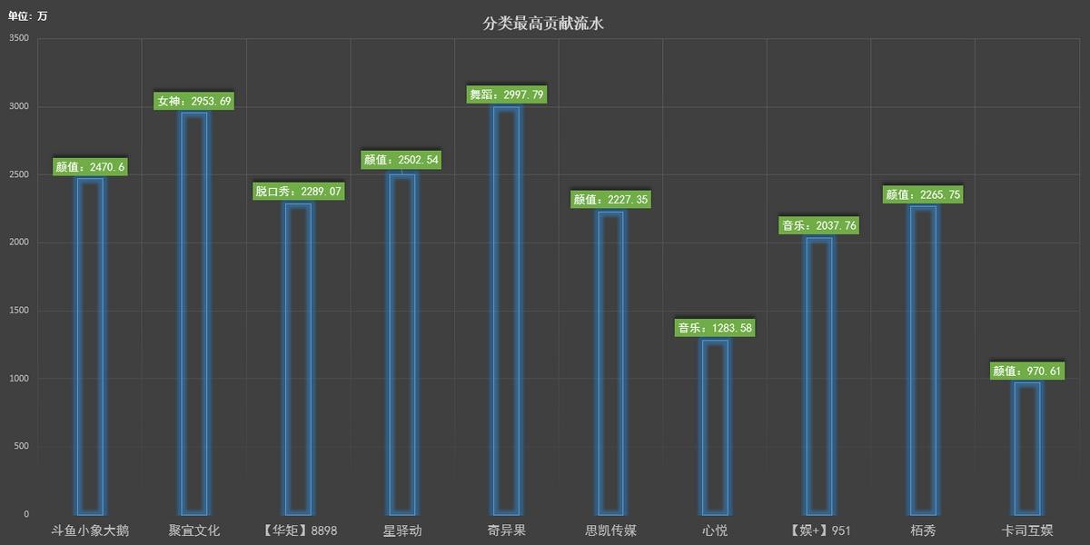 本次斗鱼入围的六家公会中,除了霸主小象大鹅外,剩余五家公会均是在粉丝节活动中流水得以暴涨。这其中包括小象在内,几家公会分区贡献最高流水,仍然以颜值、舞蹈分区为主,尤其是今年因多项限制,大部分户外主播选择转向颜值区,PK风潮再度盛行,进一步促进了颜值区主播的营收。