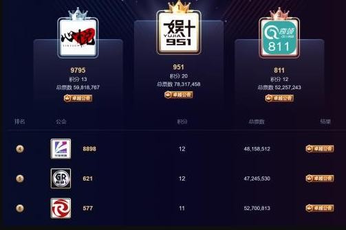 YY入围的华矩8898、心悦、娱加951在本次的年度公会预选赛中,均争夺到了六大卓越公会的名额,娱加951更是从开赛初到赛末始终保持在第一的位置。心悦公会紧随其后处于第二位,华矩排行第四位。但在本月YY的夏季头条争夺战中,华矩公会“电母”囧囧丸在公会战后惊喜回归,一晚上时间抢下两个头条,仅当天的营收就超过千万元,近三十天内总营收达到了1405万元,一人贡献了华矩三成的流水营收,让华矩公会整体流水排行迅速上升。