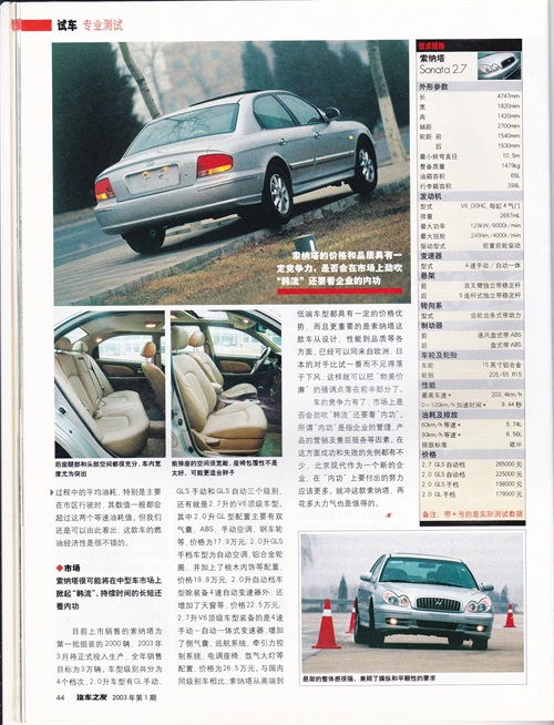 索纳塔很可能将在中型车市场上揪起“韩流”,持续时间的长短还看内功。日前上市销售的索纳塔为第一批组装的2000辆,2003年3月将正式投入生产,全年销售目标为3万辆。车型级别共分为4个档次,2.0升车型有GL手动,GLS手动和GLS自动三个级别,还有就是2.7升的V6顶级车型。其中2.0升GL型配置主要有双气囊、ABS、手动空调、钢车轮等,价格为17.9万元;2.0升GLS手动档车型为自动空调、铝合金轮圈,并加上了桃木内饰等配置,价格19.8万元;2.0升自动档车型除装备4速自动变速器外,还增加了天窗等,价格22.5万元。