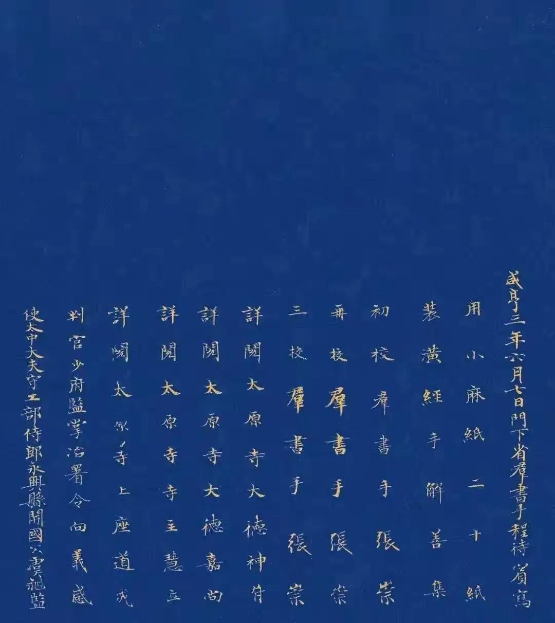 全卷纵26厘米、横490厘米,共270行5162字,字径约1厘米,采用黄檗汁染纸与蜡染工艺,历经1300年仍墨色如新。卷首“咸亨三年六月七日门下省群书手程待宾写”的款识,明确了其宫廷写经的官方属性。