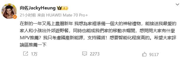 另外,他还频繁在社交平台活跃,就在1月17号,他表示自己想给家里准备一件神秘礼物,希望大家能推荐一下,结尾还特意强调这个礼物自己只考虑新能源,支持国货!