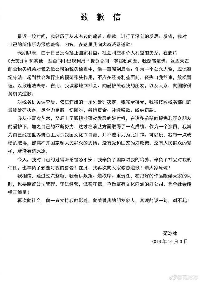 2018年10月,范冰冰因涉税问题,被处罚款8.84亿元,并刊登致歉信。偷税漏税被处罚,并被禁止在一定时间内从事演艺工作,这导致她在中国的演艺事业受到了很大的影响。