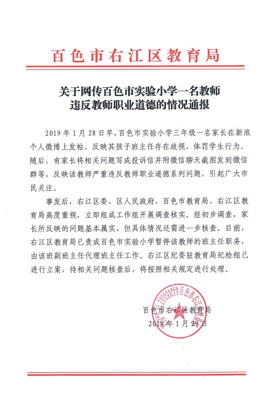 事情发生后引起了当地市民的关注,当地政府立即组成工作组进行调查,1月29日百色市右江区教育局发布通报称,当事教师已被暂停班主任职务。通报全文如下: