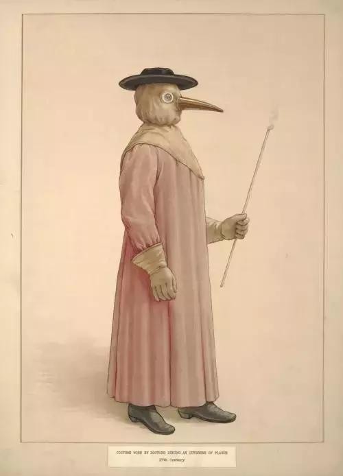 为了达到隔离效果,鸟嘴套装从上到下都用浸过蜡的油布制成,标志性的鸟嘴里面填充的是芳香物质,当时的人们相信这些香气可以阻止空气中的病毒进入人体。