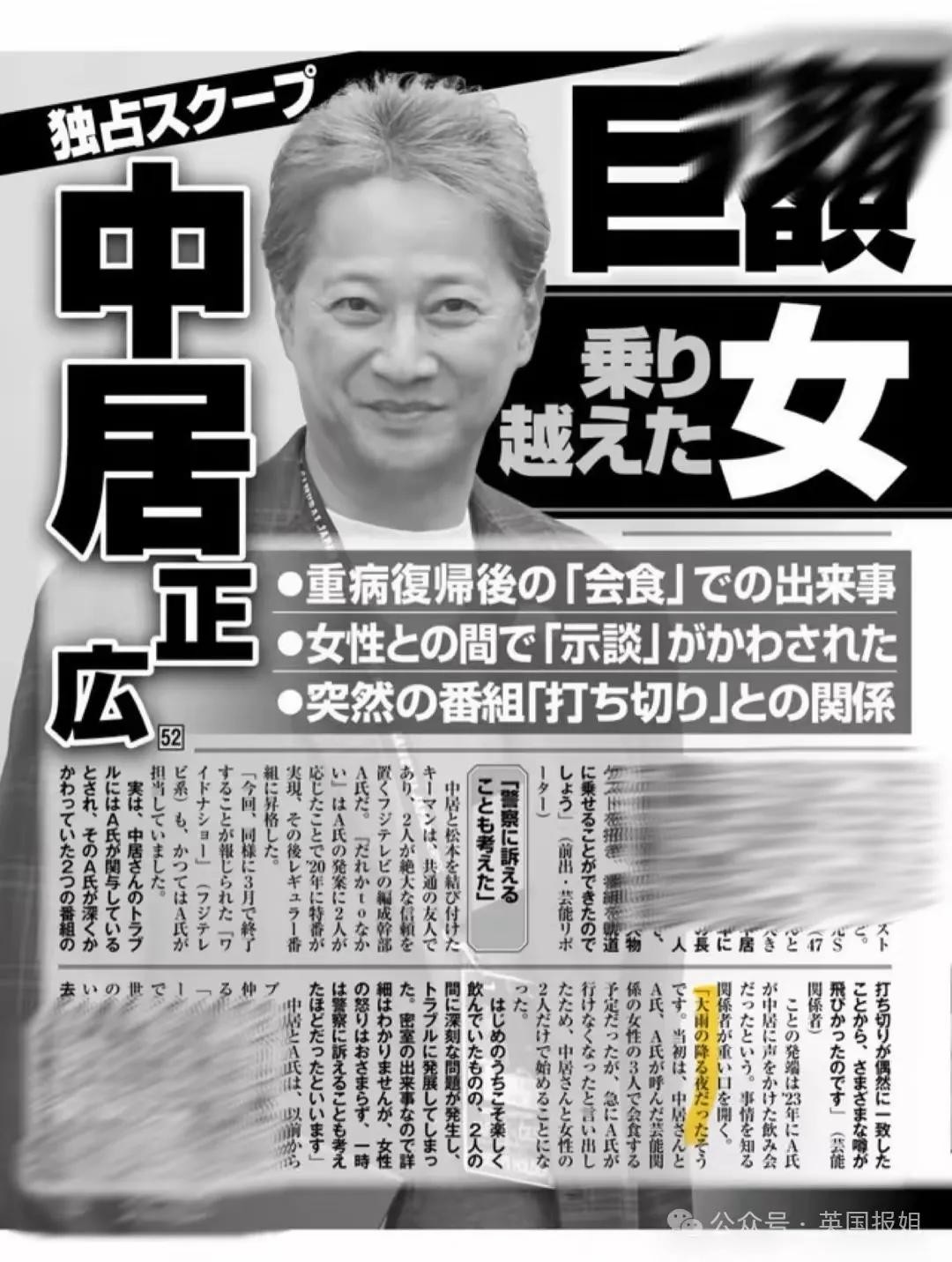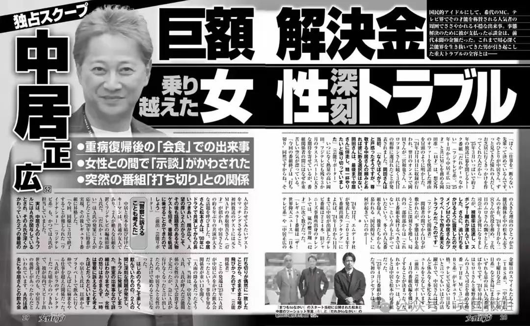 2023年12月,《周刊文春》爆出一则劲爆消息,称SMAP的前成员中居正广涉嫌性侵一名女性,且与富士电视台的某位员工有直接关联。