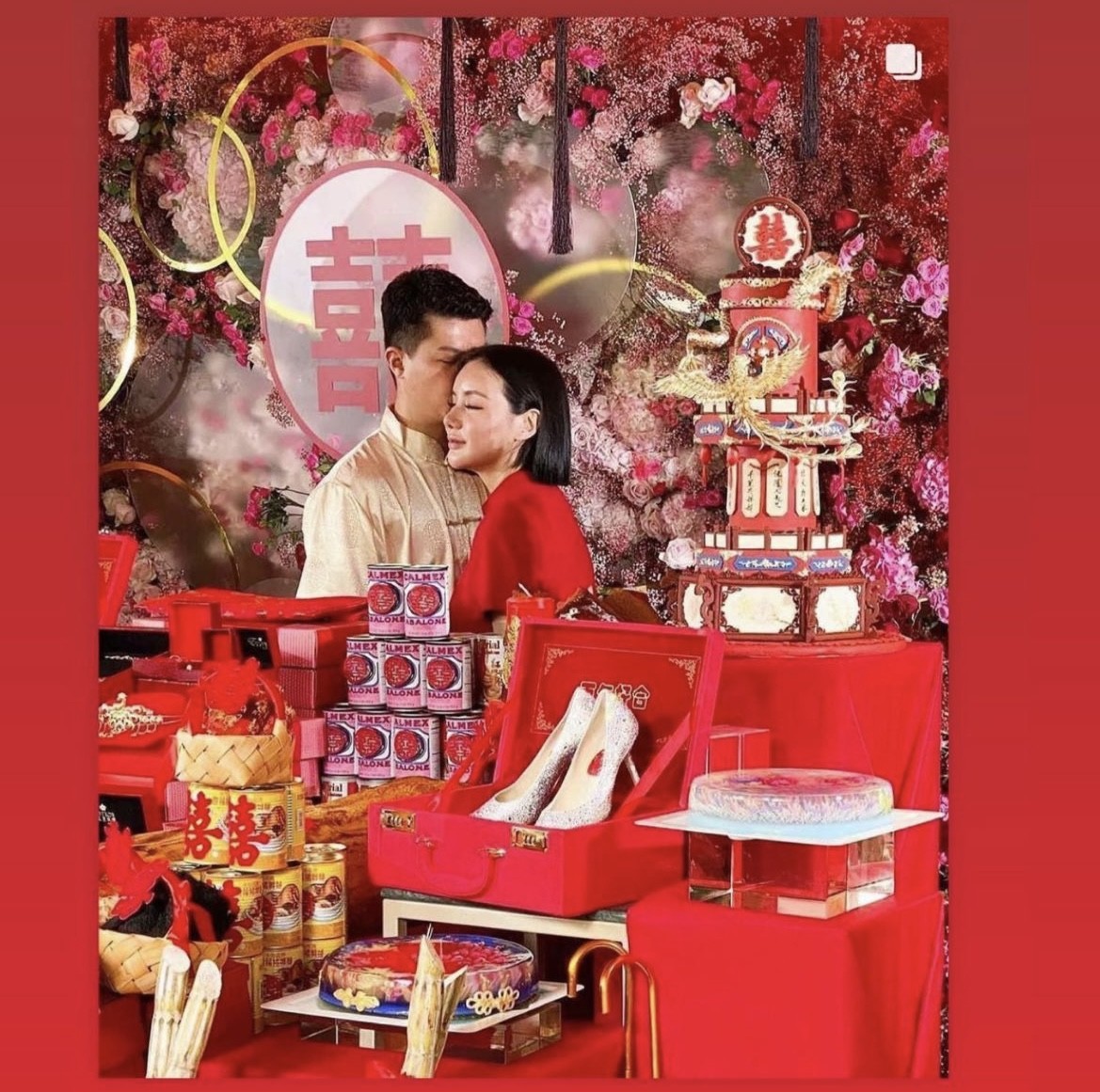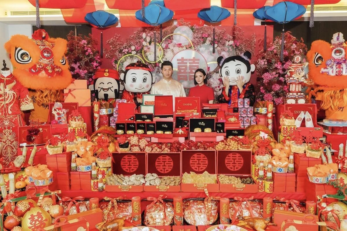 林慧俐与未婚夫身穿中国传统服饰,未婚夫穿着唐装,林慧俐穿着红色旗袍,而身旁的两位长辈穿着裙褂,一家人都非常应景,场面一派喜气洋洋。而从现场摆放的礼品来看,除了传统过大礼应该要准备的物品外,还有大颗的鲍鱼、元贝、花胶等名贵海产品,另外还有很多传统的礼物,比如裙褂、高跟鞋、狮头等,果蔬之类的,其中苹果准备188个,还有两支红酒,更有288担嫁女饼,总之样样都要齐全,才有好意头。