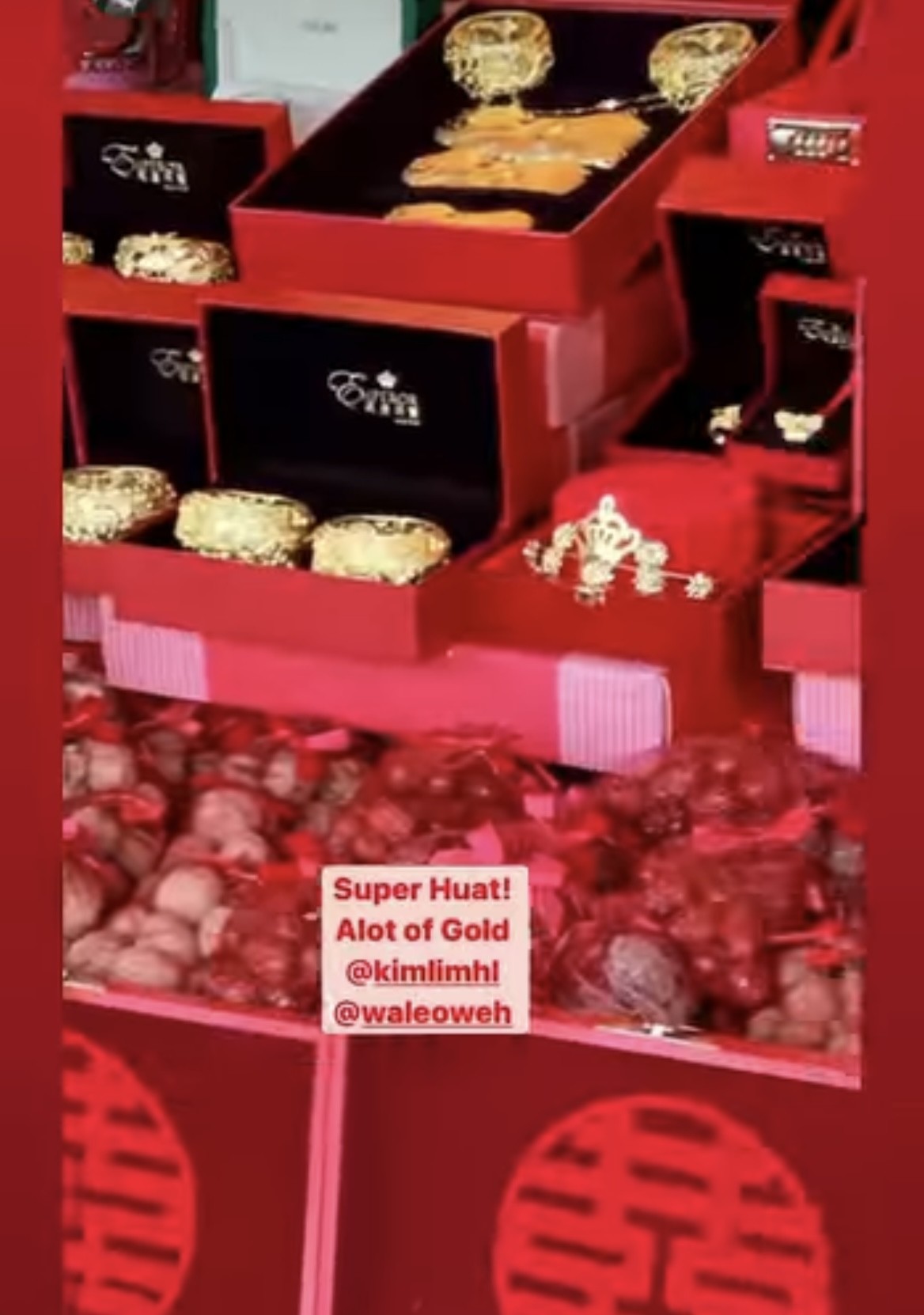 要说最抢镜的莫过于摆放在这一对新人前面至少有三排的珠宝、黄金的名贵聘礼,其中摆放在最中间的是六对巨型龙凤镯,还有一盒足金的金条,以及各类黄金首饰,此外还有钻石项链,这才是最能体现得出嫁得好的地方。而这些豪礼待到林慧俐出嫁当日,她都要穿戴在身上,届时更能让外人见识到什么才是大户人家嫁女的震撼场面,讲真,还挺期待那一天的到来。