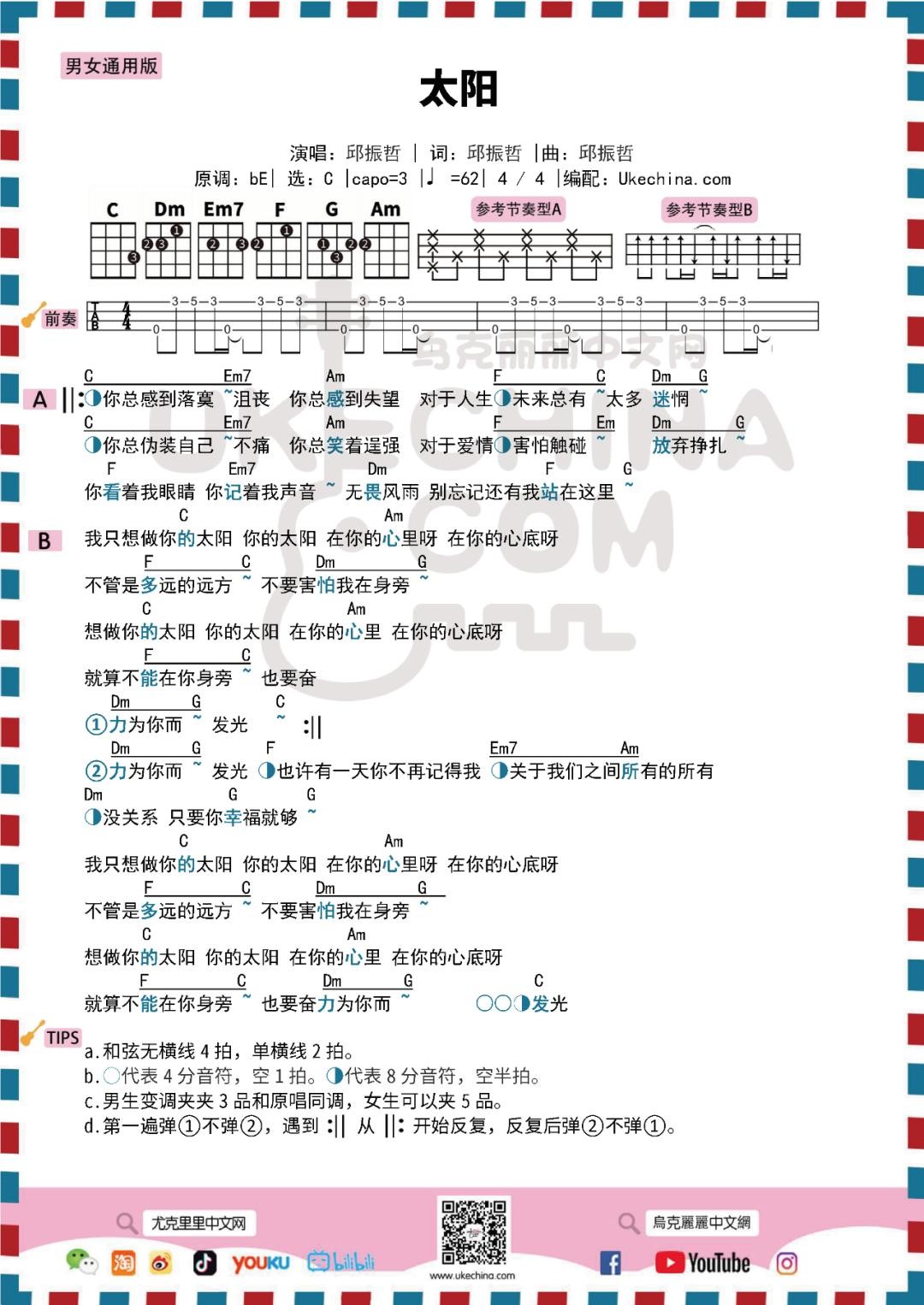 我只想做你的太阳,你的「太阳」—邱振哲 |尤克里里弹唱曲谱