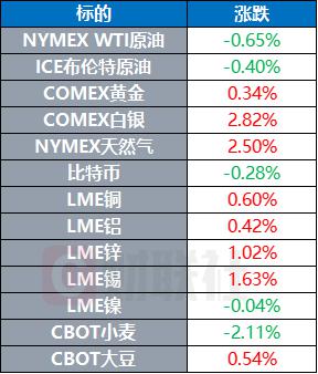 COMEX 黄金期货收涨 0.34%,报 1923 美元 / 盎司;COMEX 白银期货收涨 2.82%,报 23.37 美元 / 盎司。