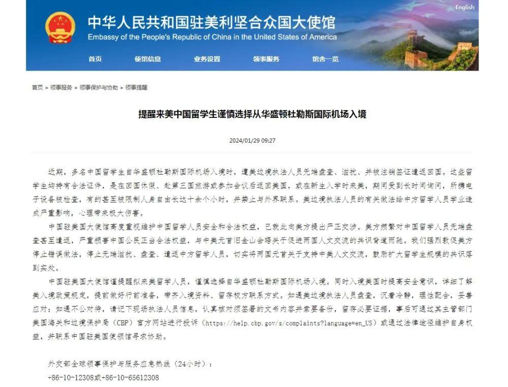 中国驻美国大使馆 29 日发布领事提醒,让赴美留学人员谨慎选择从华盛顿杜勒斯国际机场入境。