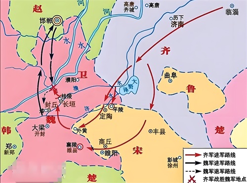 赵国快撑不下去了,只能向齐国求救,然后齐军兵分两路,一路齐军围攻魏国的襄陵,另一路由田忌、孙膑率领来救援赵国