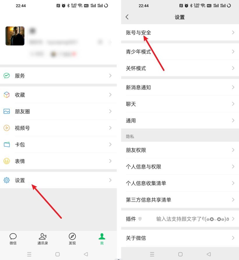 1、打开我们的微信,在【我】中找到并点击【设置】,接着点击【账号与安全】;