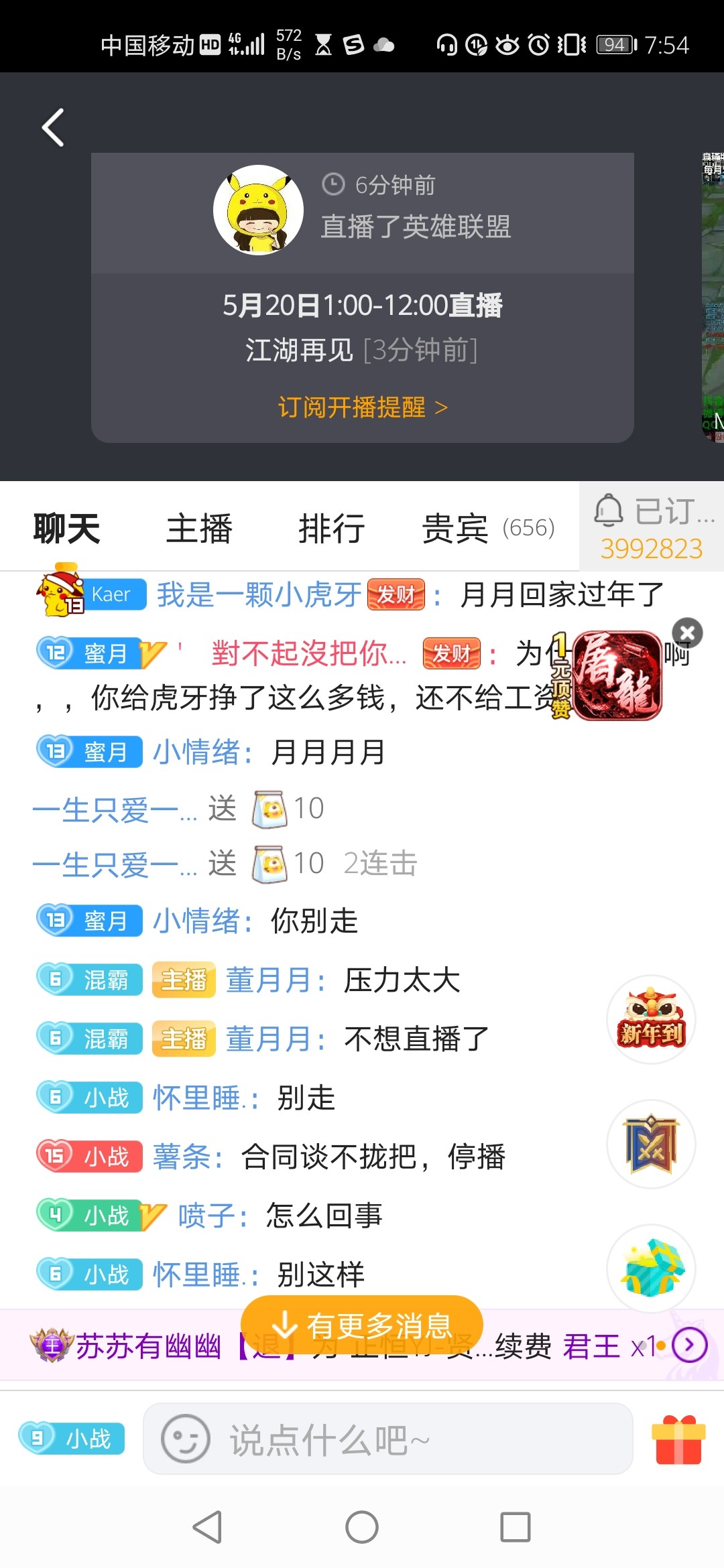 原因是虎牙因合同问题没有董月月谈好,导致董月月没有工资,董月月表示自己不是富二代,承担不起直播的费用,截图如下。