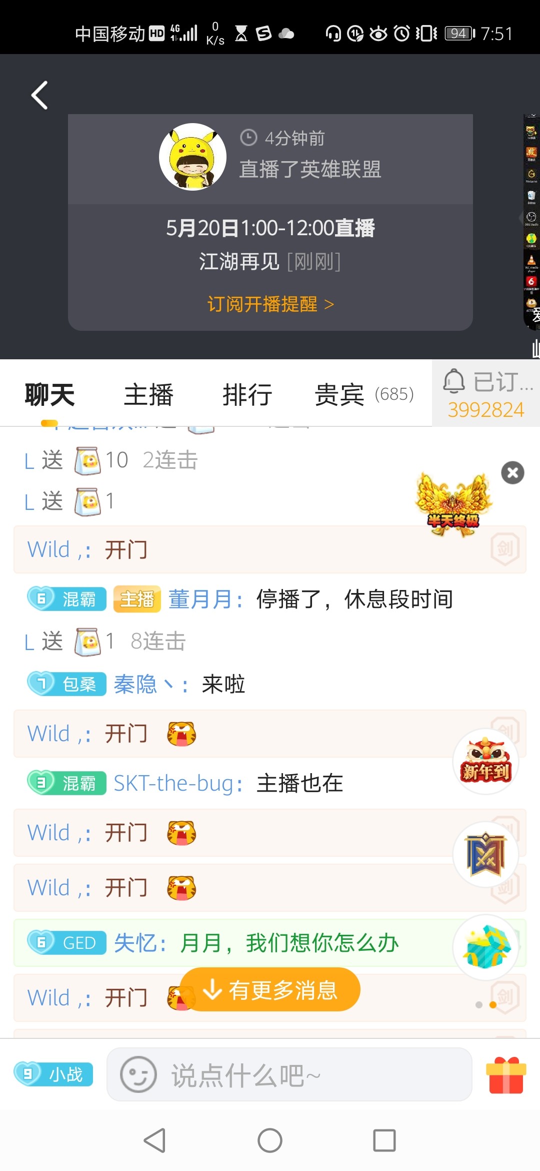众所周知,董月月和小战有段爱恨情仇,小战也直播表白过董月月,董月月也表白过小战,许多粉丝想是不是他们“造人”成功,董月月要去休产假。答案并不是,董月月在直播间打出“单身,休息段时间”的标语。同时在关播的时候也跟粉丝互动,说出了不直播的原因。