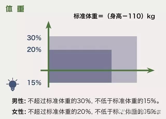 ②体重:标准体重=(身高-110)kg,男性不超过标准体重30%,不低于标准体重15%;女性不超过标准体重20%,不低于标准体重15%。