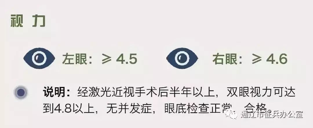 ③视力:右眼裸眼视力不低于4.6,左眼裸眼视力不低于4.5。屈光不正经准分子激光手术后半年以上,裸眼视力达到4.8,无并发症,眼底检查正常。