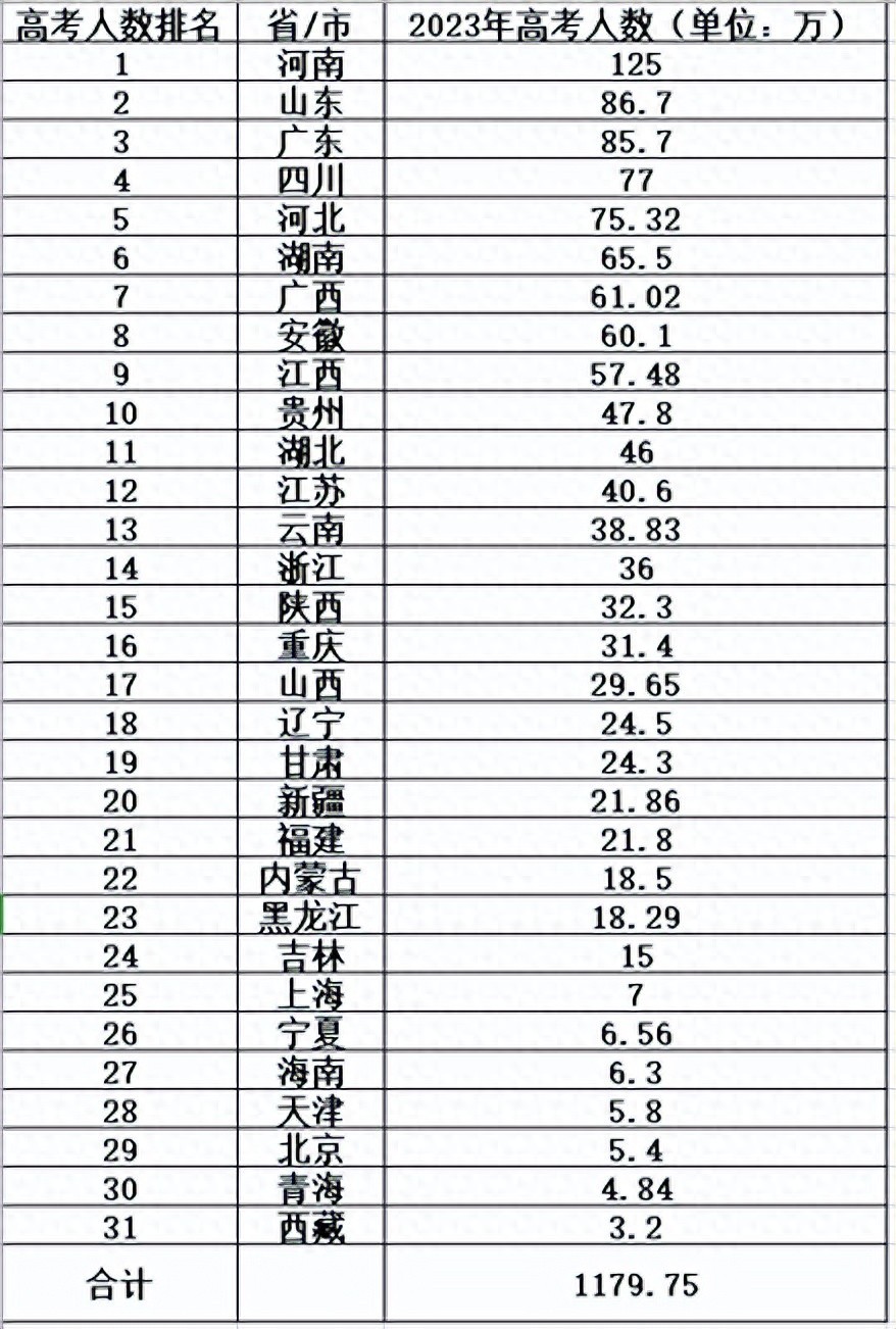 2023年全国共计1179.75万考生参加高考,其中河南省高考人数125万,在所有省份中高考人数排名第一。根据历年河南高考人数统计,2019年河南高考人数突破100万+,从2021-2021年连续三年考生数量稳定在125万左右,2024年考生数量能否迎来首次下降,这是河南考生很期待的一个事情。