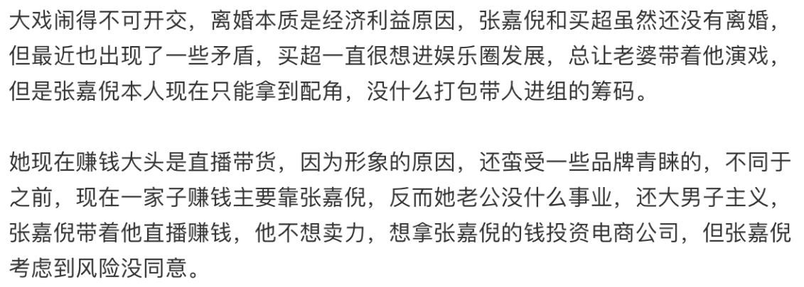 2022年上半年就有博主爆料张嘉倪和买超婚变,10月曾有媒体拍到张嘉倪深夜在街边醉酒,只有好友陪伴,不见其老公买超。但张嘉倪本人8G冲浪在线否认了醉酒,且买超的个人社交平台仍在时常秀恩爱,吃瓜网友便没有当真,谁曾想这才过去一个月就……