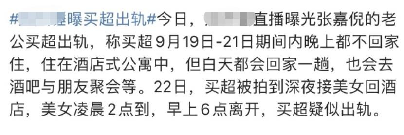 从视频来看,买超9月19日-21日期间晚上都没有回家,而是住在酒店式公寓中,但白天会回家一趟,也会去酒吧与朋友聚会等。22日,买超深夜接了一位女生同回酒店,女方早上6点才离开,疑似出轨。随后该媒体补充称,张嘉倪和买超两人的感情疑似已出现问题,可能已经分居。